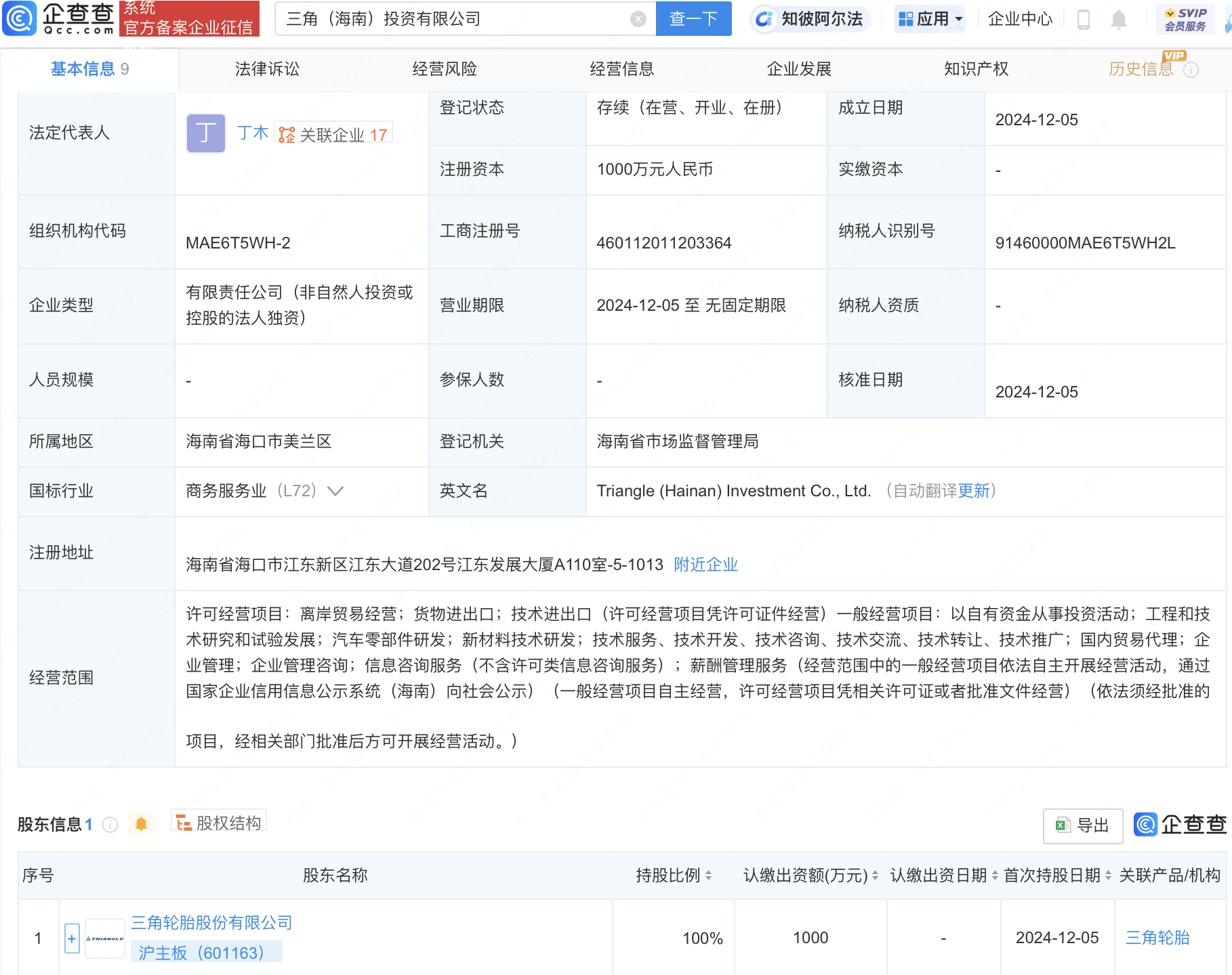 企查查APP显示,近日,三角(海南)投资有限公司成立,法定代表人为丁木,注册资本1000万元人民币,经营范围包含:以自有资金从事投资活动;工程和技术研究和试验发展;汽车零部件研发;新材料技术研发等。企查查股权穿透显示,该公司由三角轮胎(601163)全资持股。