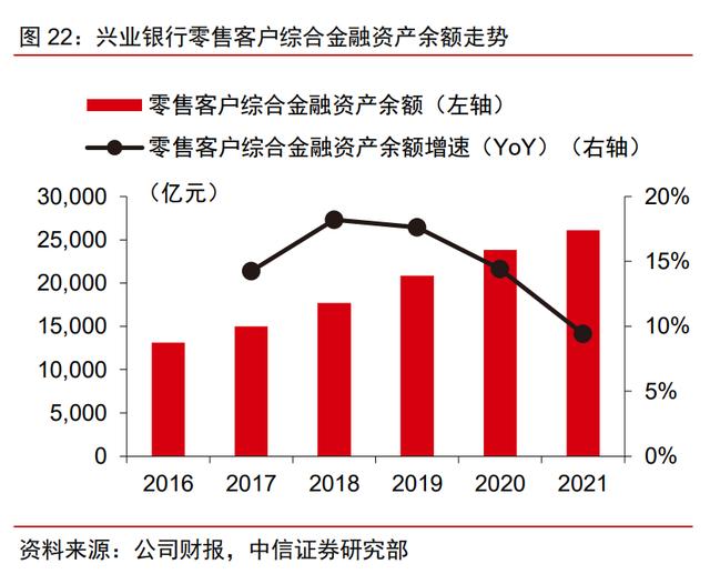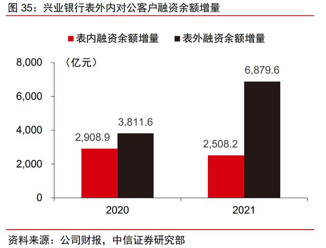 表外业务规模增速快于表内。兴业银行整合全市场资源,对内整合集团内各业务单元,对外联合公募、券商、保险、信托、私募股权、政府投资基金等机构,大力推动表内资产向表外流转、客户融资与代客资金在表外对接、客户财富管理需求从表外实现。2021 年全年,兴业银行实现表外对公融资余额增速 21.90%,快于表内对公融资余额增速 8.59%,表外零售理财增速 17.51%,高于表内零售存款增速 8.37pcts。