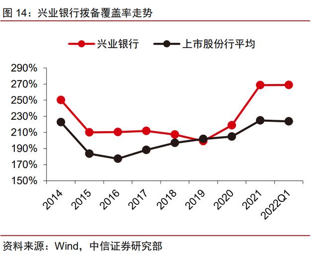 拨备水平持续夯实,兴业银行拨备覆盖率在 2019 年之后大幅改善,截至 2022Q1 末,拨备覆盖率已达 268.89%。拨贷比企稳回升,因前几年的持续大额核销,兴业银行 2016-2020 年拨贷比有一定下滑,2021 年开始企稳回升。(报告来源:未来智库)