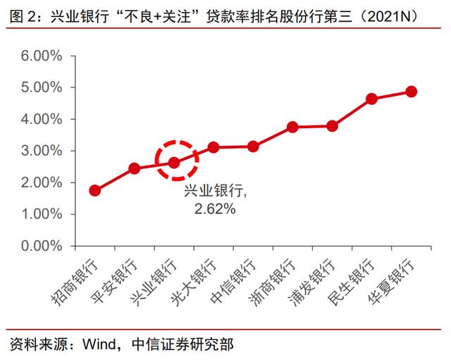 动态看,兴业银行 2021 年拨备覆盖能力提升。兴业银行 2021 年在计提力度下降的同时,2021N 拨备覆盖率同比提升 49.9pcts,说明新增减值损失的同比下降来源于资产质量的明显改善。