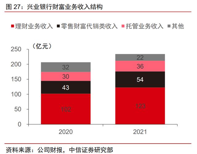 财富业务收入以理财业务收入为主,2021 年理财业务收入占比超过 50%。依托同业朋友圈优势,积极拓展理财产品在同业渠道销售,2021 年通过“财富云”向国股行、中小行和农信社零售客户销售理财突破 6,676.39 亿元,同比增长 429.18%。2022 年一季度在整体市场理财规模增长相对乏力背景下,通过“财富云”销售理财规模达到 3,149 亿元,同比增长 55.43%。 2022 年以来市场波动环境下,财富业务收入韧性更强。2021 年兴业银行基金代销在手续费和佣金净收入中占比仅 4.8%,低于招行银行和平安银行,在 2022 年以来资本市场波动较大环境下呈现韧性。