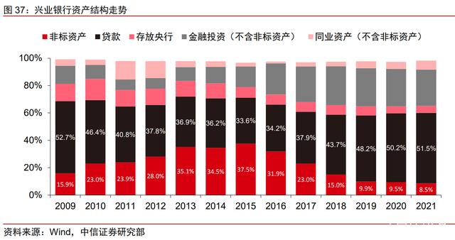 负债端:压降同业负债同时保持同业资金优势。央行在 2017 年二季度货币政策执行报告中宣布拟于 2018 年一季度将同业存单纳入 MPA 同业负债占比考核,“同业负债+同业存单”合并规模不得超过负债总额的三分之一。兴业银行“同业负债+同业存单”规模在总负债占比较 2016 年末下降超 10pcts 至 33%左右,既满足监管要求,也最大程度保持自身同业资金优势。与此同时,存款占比提升明显,2021 年末存款占比较 2016 年末提升 9.3pcts 至 56.3%。(报告来源:未来智库)