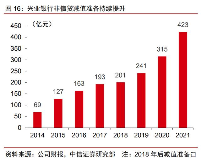 非信贷风险抵补能力同样大幅提升。考虑兴业银行非信贷资产较多,以“非信贷减值准备/非标资产”和“非信贷减值准备/(非标资产+公司债券+资产支持证券)”分析非信贷拨备情况,这两项指标在长期改善之后在 2021 年末分别达到 5.93%和 3.83%,高于同期拨贷比(2.96%),说明兴业银行针对非信贷资产做了充足的风险准备,风险抵补能力大幅夯实。