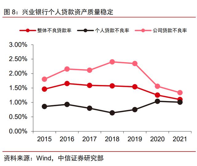 (3)个人贷款:个人住房贷款贡献主要增量,根据不良率灵活调节。兴业银行个人贷款增量结构中,不良率较低的个人住房及商用房贷款长期贡献主要增量,2016 年以来占累计增量超 60%。 2021 年为响应房地产贷款调控政策,个人住房贷款增量有所控制,但仍贡献了增量超 40%。此外兴业银行根据品种不良贷款率灵活调节,显著提升不良率持续改善的个人经营性贷款增量,压降不良率抬升的信用卡贷款增量。