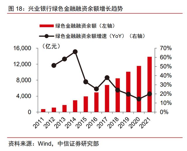 当前绿色金融仍是监管稳增长和结构性宽信用的主要指导方向之一,兴业银行凭借绿色金融专业优势、品牌优势、客群优势和项目积累,预计可以贡献大量优质表内外资产。我们预计,公司有望在未来 3-5 年实现绿色金融表内外融资余额超 2 万亿元,人民银行口径的绿色贷款余额达 7,000-8,000 亿元。(报告来源:未来智库)