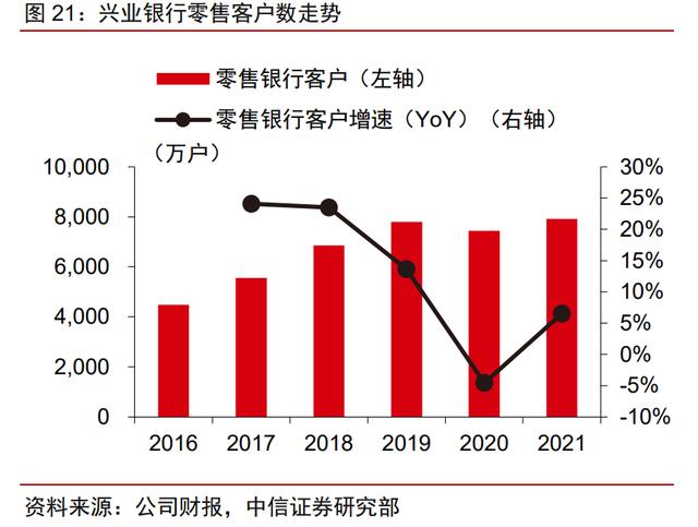 零售客户数止跌回升,财富客户数稳步增长。2021 年零售客户数增速重新回正,截至 2021 年末,兴业银行零售客户总数近 8,000 万户,同比增长 6.54%;零售财富客户数 392.11 万户,同比增长 10.67%。财富业务基础逐渐夯实,财富管理规模持续扩张。截至 2021 年末,集团零售客户综合金融资产规模 2.85 万亿元,同比增长 9.01%,其中零售财富类综合金融资产余额 1.81 万亿元,同比增长 9.86%。