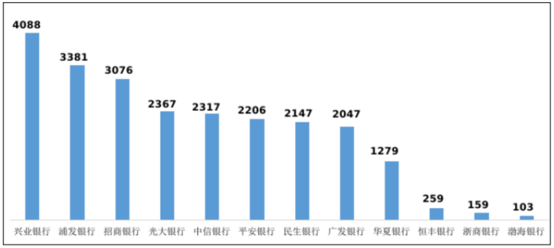 股份制商业银行信用卡业务投诉量的中位数为2176.5件。其中,兴业银行4088件,占兴业银行投诉总量的85.1%;浦发银行3381件,占比80.7%;招商银行3076件,占比81.0%;光大银行2367件,占比83.7%;中信银行2317件,占比79.4%;平安银行2206件,占比74.8%;民生银行2147件,占比81.5%;广发银行2047件,占比88.9%。