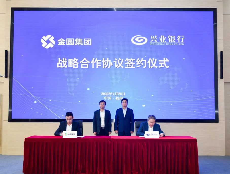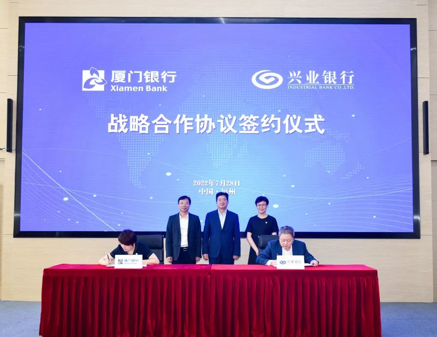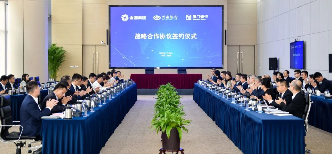 7月28日,兴业银行与金圆集团、厦门银行在福州分别签署战略合作协议。兴业银行党委书记、董事长吕家进,金圆集团党委书记、董事长檀庄龙,金圆集团党委副书记、总经理、厦门银行党委书记姚志萍见签,兴业银行党委委员张霆,金圆集团党委委员、总会计师杨清榕,厦门银行党委委员、副行长兼董事会秘书陈蓉蓉代表三方签约。