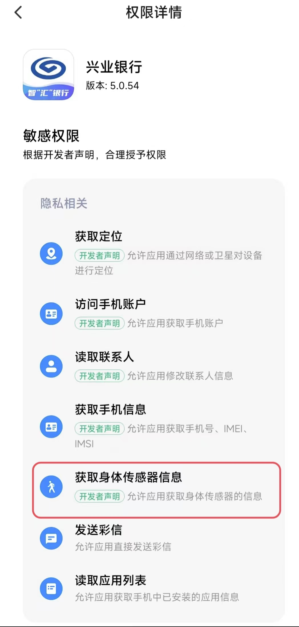 《中国银行保险报》注意到,根据上海市消保委微信团队的测试,安卓系统vivo应用商店显示,兴业银行APP(版本5.0.54)需要获取21项权限,其中包括“访问身体传感器(如心率监测器)”,对于该权限的解释是“允许该应用软件存取监测您身体状况的传感器所收集的数据,例如您的心率”。
