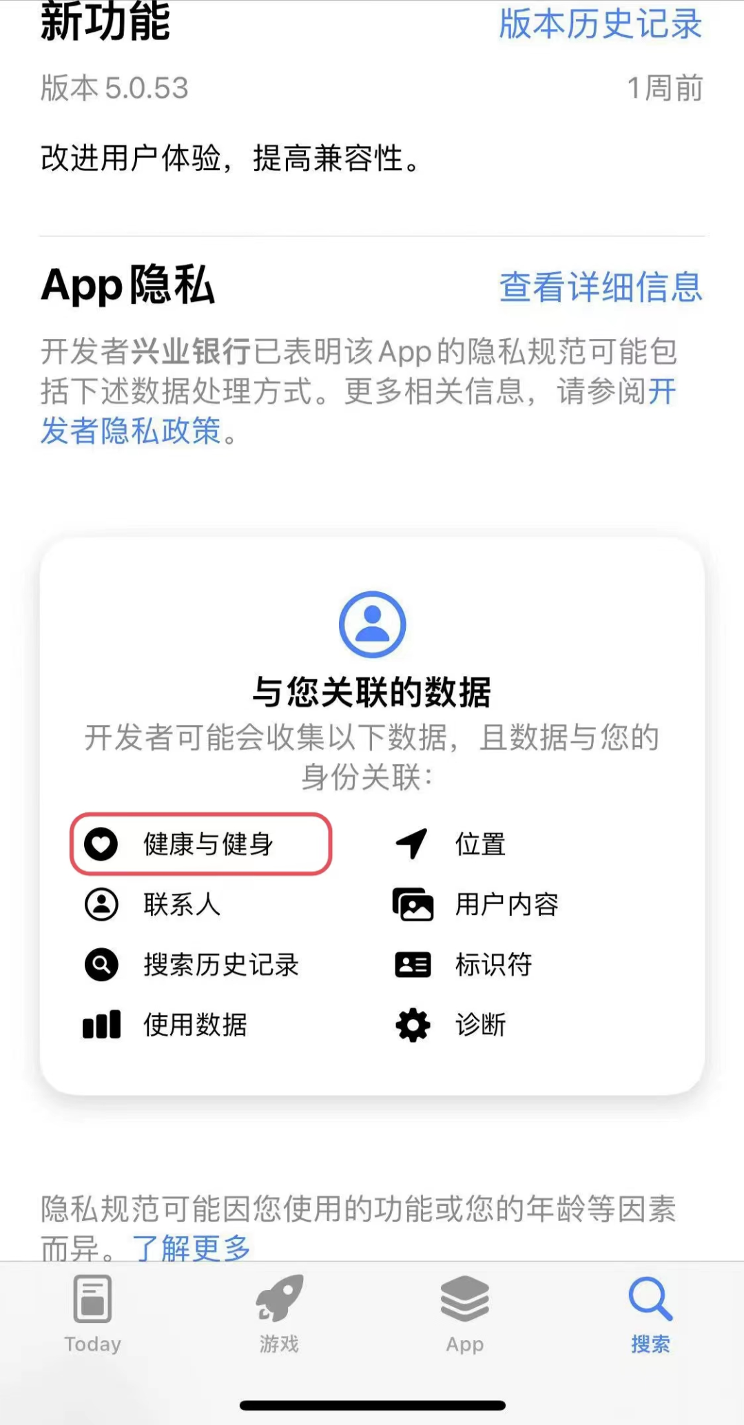 《中国银行保险报》了解到,目前,除兴业银行外,还有多家银行APP会收集用户“健康与健身”数据,包括中信银行、平安银行、广发银行等。