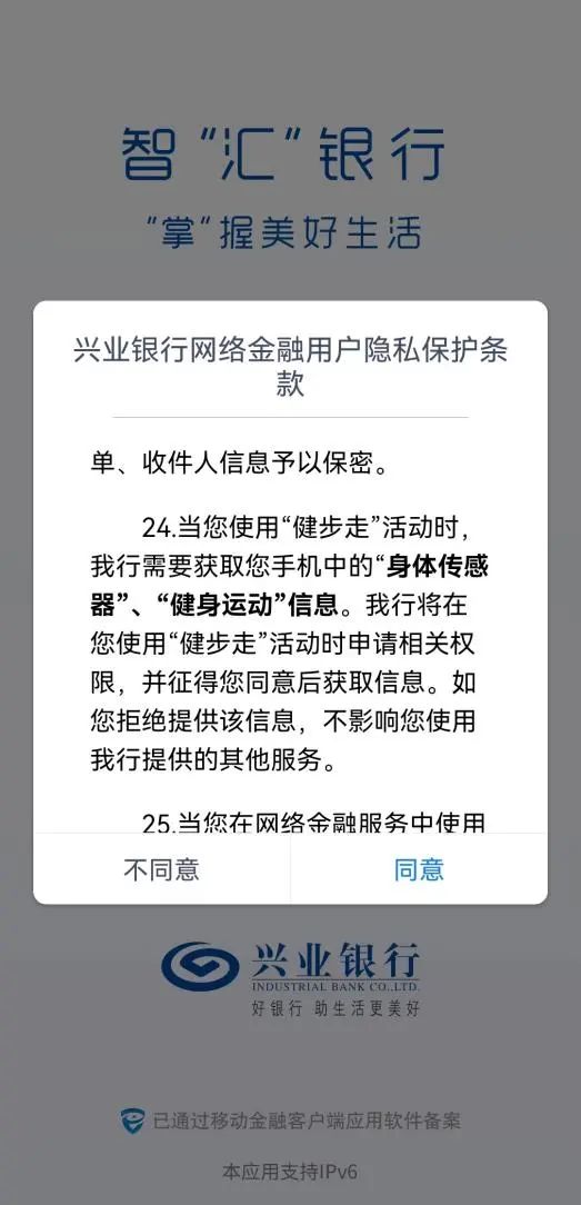 兴业银行表示,为倡导健康低碳的生活方式,该行拟面向客户阶段性开展“健步走”活动,在活动中需通过手机“身体传感器”获取客户步数信息(不涉及心率等个人健康信息),并根据参加活动的用户步数提供一定奖励。