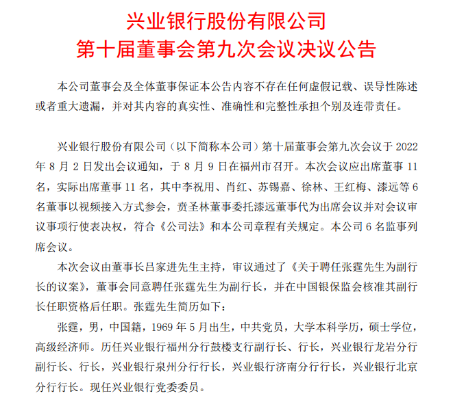 兴业银行8月9日发布公告称,董事会审议通过了聘任张霆为该行副行长的议案,此任职资格尚需银保监会核准。