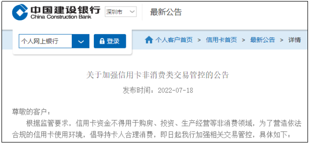 7月18日,建设银行发布《关于加强信用卡非消费类交易管控的公告》,明确该行行用卡不得在房地产类商户(1520、1771、7013)、投资理财类商户(6051、6012、6211)、烟草经营类商户(4458)、境内房产税费类商户进行交易。同时,对物业及分时用房类商户(6513、7012)、境内纳税类商户(9311)、批发商及建筑装饰材料批发商户(5998、5039)、人身保险类商户等进行一定的限制交易。