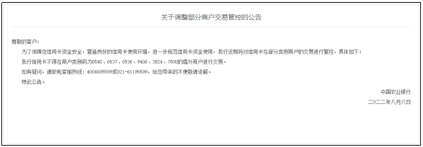 8月8日,农业银行宣布对信用卡在部分类别商户的交易进行管控,该行信用卡不得在商户类别码为6540、6537、6536、9406、3824、7800的境外商户进行交易。在此之前,农行已针对信用卡业务接连发布了多则公告,包括去年10月份农行关闭保险类商户(商户类别码为5960、6300)的信用卡外币交易,今年3月农行关闭信用卡烟草代扣交易。