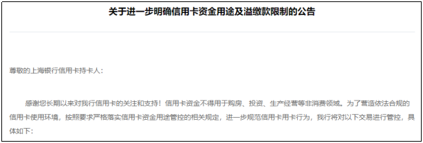 8月4日,上海银行发布《关于进一步明确信用卡资金用途及溢缴款限制的公告》,宣布该行信用卡不得在房地产类商户(1520、1771、7013)、境内房产税费类商户(9312)、彩票类商户(7995)、投资理财类商户(6211、6051、6541)进行交易。同时在物业及分时用房类商户(6513、7012)设定交易限制,并强调信用卡不得用于生产经营领域,如批发业务涉及的烟草配送类商户(4458),或其他批发、经营类税收等。