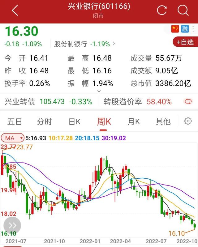兴业银行(601166)从0615号的最高点21元跌到了当前16.3元,跌了23%。然而在12号行情这么好的情况下,也没有反弹多少。根据这样的情况后续可能还会继续下跌,参考202003的最低点14.93元。有可能会跌到这个价位,再严重点参考201807的最低点13.73元。不过也要看短期内能不能跌破16元。这几天股价都在16.1元与16.5元之间徘徊,看样子还挺稳的。参考8与9的月份,走势都是横盘微涨向下,所以10月的走势看上去也不太乐观。