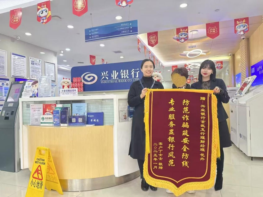 2025年1月16日,兴业银行南京玄武支行收到了客户丁女士送来的锦旗,感谢兴业银行为她挽回差点损失的30万元资金。就在1月2日,客户丁女士接到自称“拼多多客服”的陌生电话,称其点入了百万元保险链接需要解除,因解除保险需要手续费,需要将银行定期账户转为活期,并转账至对方提供的微信账户,丁女士随即按照要求分三次操作,将30万元定期存款转至个人活期账户。
