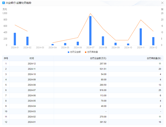 《极客洞察2024年度银行监管处罚分析报告》数据显示,2024年银行业机构罚单数量近3年最低,总罚没金额较2023年同比降低45%。行业合规性整体改善下,兴业银行合规压力不减反增。