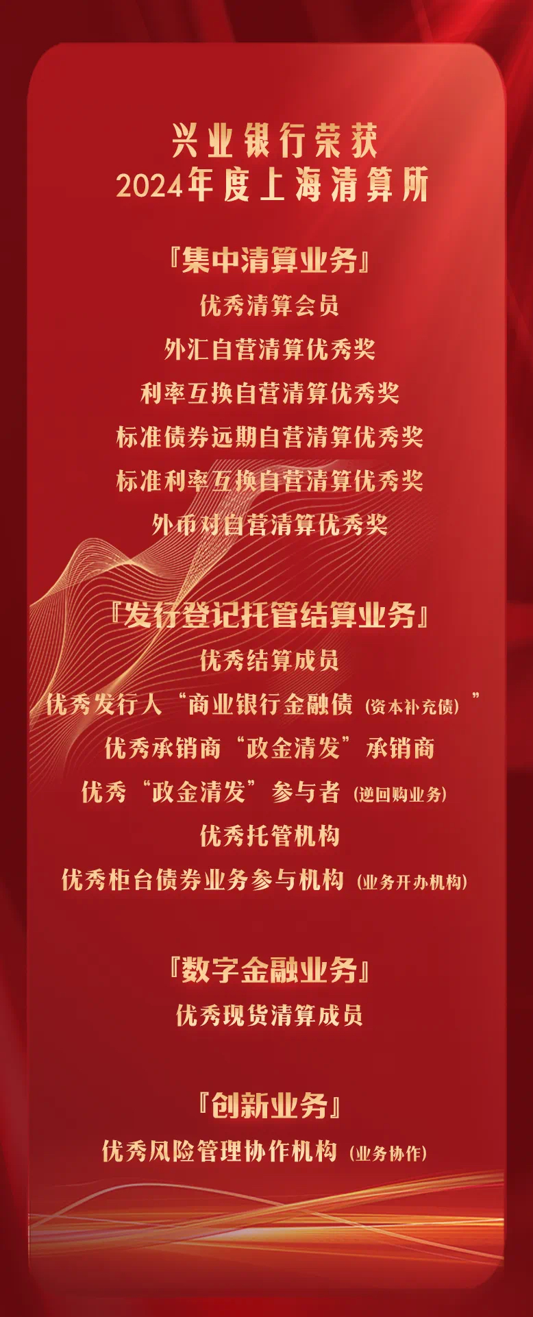 长期以来,兴业银行坚持前、中、后台相分离的现代化商业银行管理体制,发挥会计后台新兴业务集中的专业优势和人才优势,通过流程再造、引进RPA技术等方式,提高业务效率,在保障兴业银行金融市场交易活跃,全年业务顺畅的同时,实现各类本外币资金及时交收清算无差错,主流业务品种市场排名稳居市场前列。2020年,兴业银行信用债承销市场排名第1名,标准债券远期清算笔数市场排名第2位,代理清算业务市场排名第2位,信用债发行市场排名第2位,人民币利率互换集中清算量排名市场第3位。基于兴业银行的优异表现,2016-2020年连续五年被上海清算所评为“优秀结算会员”,并连续两年排名市场第一;连续五年被上海清算所评为“优秀清算会员”“优秀发行人”“优秀承销商”“外汇自营清算优秀奖”“利率互换自营清算优秀奖”。