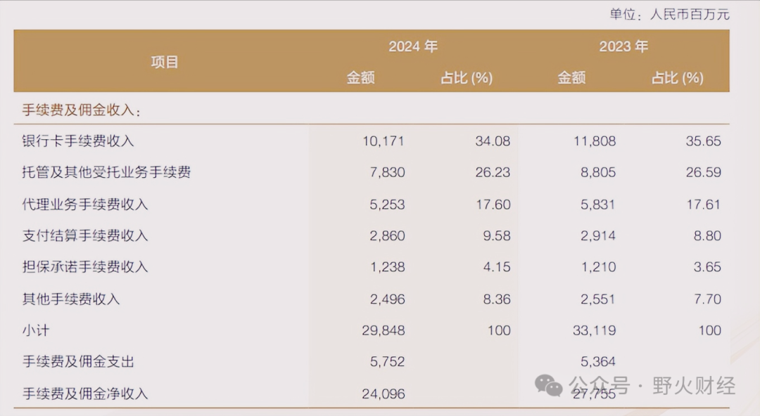 其中,银行卡手续费减少大约16亿元至102亿元,托管和受托业务手续费减少10亿元至78亿元。手续费和佣金整体完成298亿元,减少33亿元,但支出却增加了4亿元。