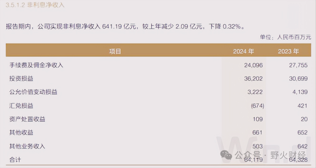 非利息净收入也有很多项,其中手续费和佣金241亿元,减少36亿元,投资收益362亿元,增加55亿元,公允价值变动损益32亿元,减少9亿元,汇兑损失近7亿元,2023年则获益4亿元,其他项变化不大。