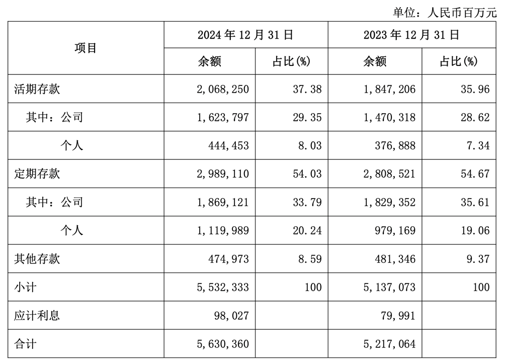 在做强负债方面,兴业银行坚持存款立行的原则,把拓展低成本结算性存款、降低存款成本作为稳定息差的关键。2024年末,该行存款总额达5.53万亿元,较上年末增加3953亿元,较上年末增长7.69%,远高于负债总体增速,存款占比接近58%;存款付息率1.98%,同比下降26个基点,降幅领跑同业。
