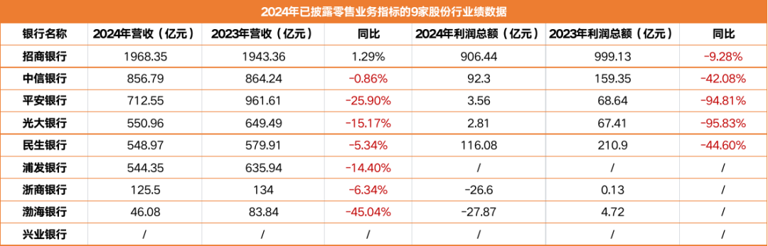 整体上看,股份行零售业务盈利指标营业收入、利润总额普遍下行。