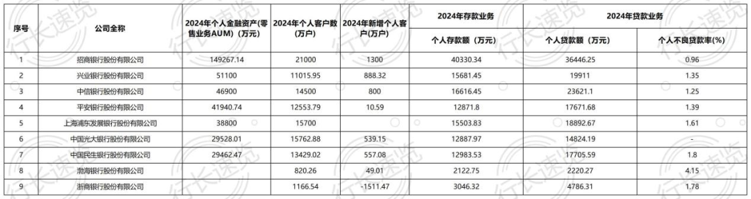 具体来看,7家披露数据的股份行2024年个人金融资产(零售业务AUM)均实现同比正增长。其中,招商银行14.92万亿、兴业银行5.11万亿元,中信银行4.69万亿元包揽前三甲。其后分别为平安银行、浦发银行、广发银行、民生银行,零售AUM分别为4.19万亿元、3.88万亿元、2.95万亿元、2.94万亿元。