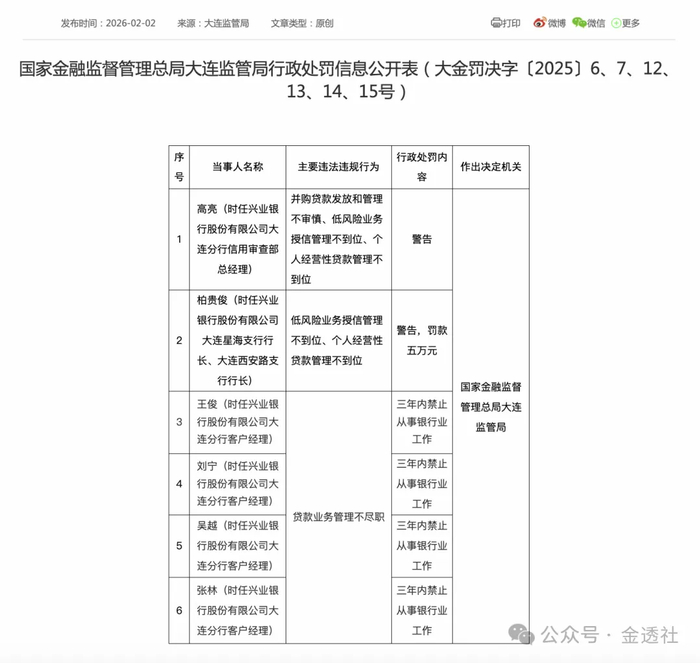 据国家金融监督管理总局大连监管局2月2日公开的行政处罚信息显示,兴业银行股份有限公司大连分行因信贷业务相关违法违规行为,多名时任责任人受到处罚,其中4名客户经理被处以三年内禁止从事银行业工作的严厉处罚,彰显了监管部门整治银行业违规行为、强化从业人员合规管理的坚定态度。