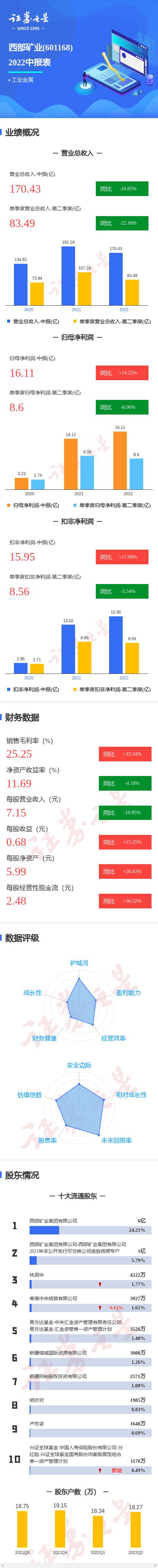 西部矿业 2022 中报显示,公司主营收入 170.43 亿元,同比下降 10.85%;归母净利润 16.12 亿元,同比上升 14.22%;扣非净利润 15.95 亿元,同比上升 17.08%;其中 2022 年第二季度,公司单季度主营收入 83.49 亿元,同比下降 22.16%;单季度归母净利润 8.61 亿元,同比下降 8.06%;单季度扣非净利润 8.56 亿元,同比下降 3.34%;负债率 62.64%,投资收益 1.56 亿元,财务费用 3.86 亿元,毛利率 25.25%。