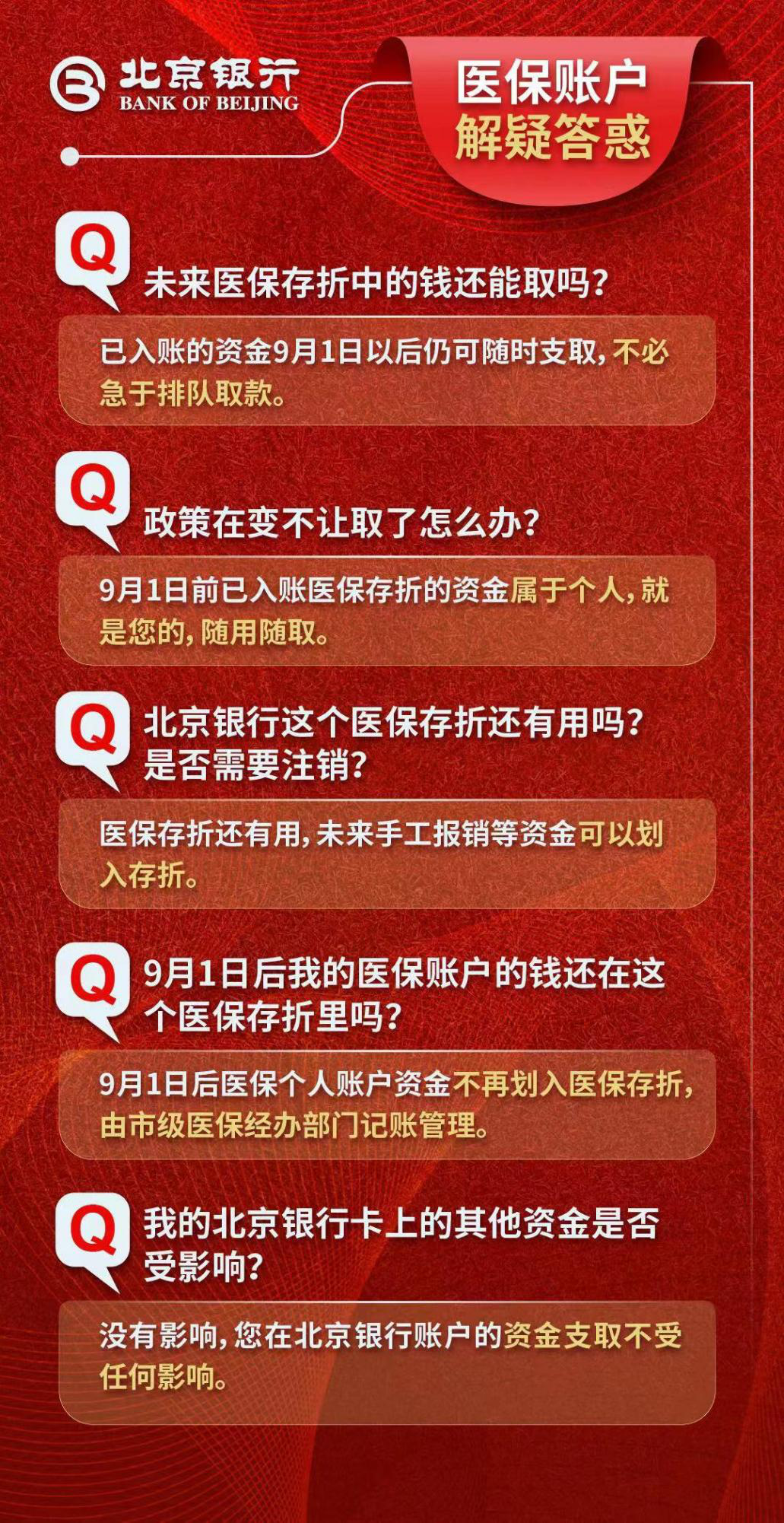 根据北京市医疗保障局《关于调整本市城镇职工基本医疗保险有关政策的通知》(京医保发〔2022〕28号)的相关政策要求,“自2022年9月1日起,医保个人账户资金由市级医保经办部门记账管理,实行专款专用。”我行在此提示广大医保客户: