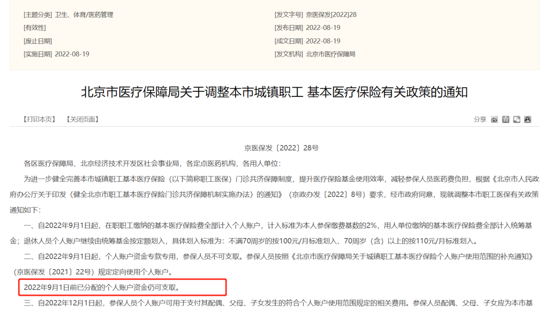 日前,北京市医保局印发《关于调整本市城镇职工基本医疗保险有关政策的通知》(京医保发〔2022〕28号),明确自2022年9月1日起,个人账户资金实行记账管理,参保人员不可自由支取,实现定向使用。