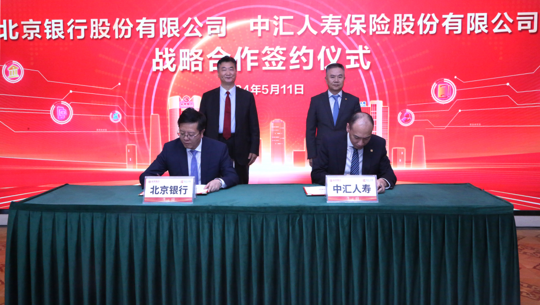 5月11日,北京银行与中汇人寿保险股份有限公司(简称“中汇人寿”)在北京银行大厦举行战略合作签约仪式。中汇人寿党委书记、董事长任小兵,总裁杨征,北京银行党委书记、董事长霍学文,副行长戴炜等领导出席活动。