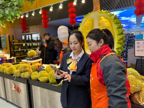 北京银行客户经理为新发地市场榴莲馆的商户介绍特色金融服务。