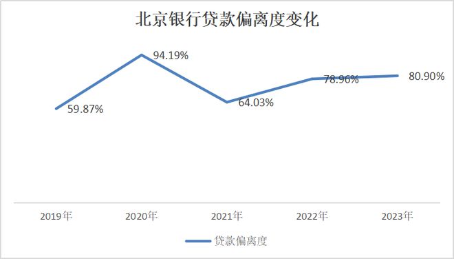 从2021年末到2023年末,北京银行贷款偏离度上升了约17个百分点至81%左右。