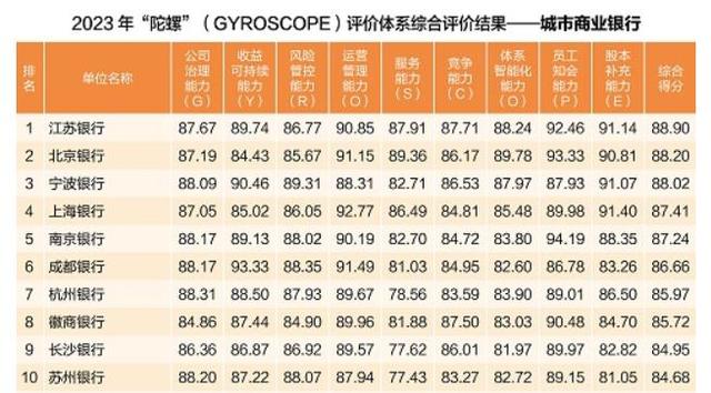2023年“陀螺”(GYROSCOPE)评价体系综合评价结果——城市商业银行部分。