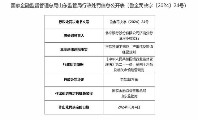 6月7日,国家金融监管总局山东监管局发布信息,显示北京银行股份有限公司济南分行滨河小微支行因贷款管理不到位,严重违反审慎经营规则,被国家金融监督管理总局山东监管局作出罚款35万元的行政处罚决定。