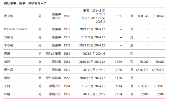在冲刺业绩、转型升级的过程中,北京银行还面临着人事频繁变动的风险。根据2024年报,北京银行离任的董监高共10名,其中包括原行长杨书剑、原副行长王健、原副行长韩旭。