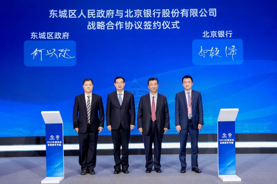 9月11日,在2025年中国国际服务贸易交易会北京首钢园区会场,北京银行与北京市东城区人民政府签署战略合作协议。中共北京市委金融委员会办公室副主任潘琍,东城区委副书记、区长陈献森,东城区政府党组成员、副区长何兴达,东城区政协党组成员、副主席贾邦,北京银行党委书记、董事长霍学文,北京银行副行长郭轶锋等领导出席。