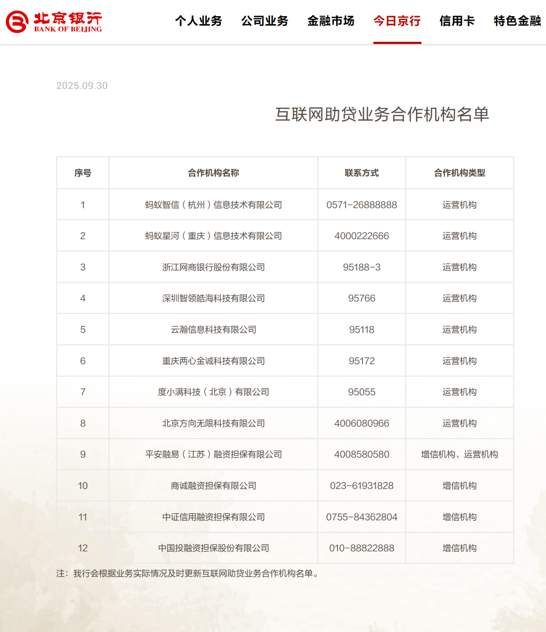 今年9月30日, 北京银行 官网公告了互联网助贷业务合作机构名单,共计12家,如下图所示: