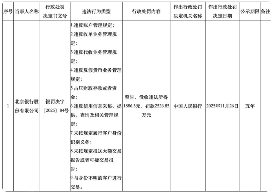 业绩低迷之余,合规风险的集中爆发更让 北京银行 雪上加霜。2025年以来, 北京银行 在业绩承压的同时,合规风险集中暴露,成为影响其经营的重要因素。从总行到多地分支机构,违规问题密集出现,覆盖账户管理、反洗钱、信贷“三查”、消费者权益保护等多个关键业务环节,呈现跨区域、多条线蔓延的态势,使其经营压力进一步加大。尤其是11月26日央行对 北京银行 开出的2527万元罚单,为其年内第三笔千万级处罚,将这轮合规风暴推至高点。