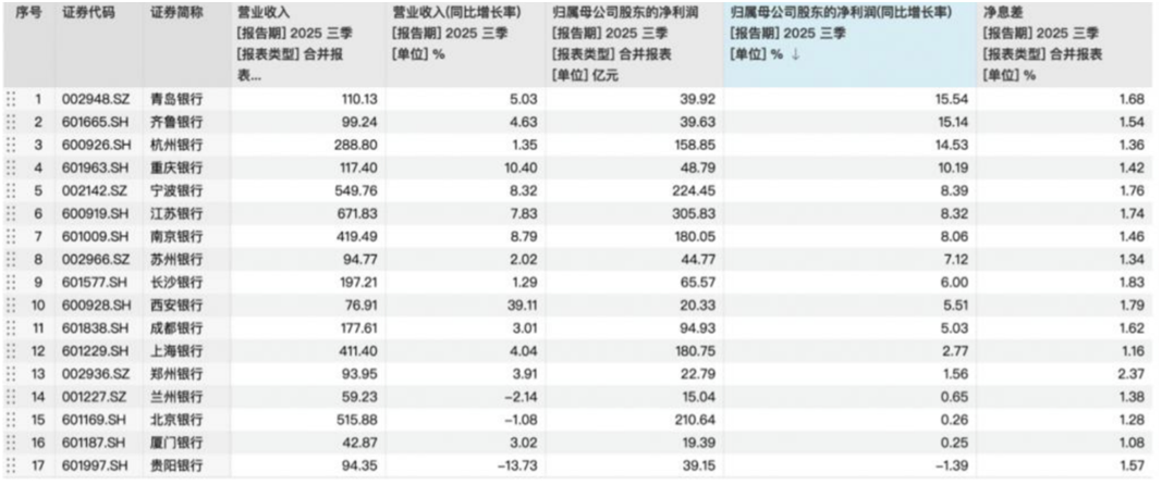 2025年三季度17 家上市城商行营业数据,来源: Wind