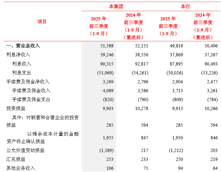 北京银行 2025年第三季度营业数据,来源: 北京银行 财报