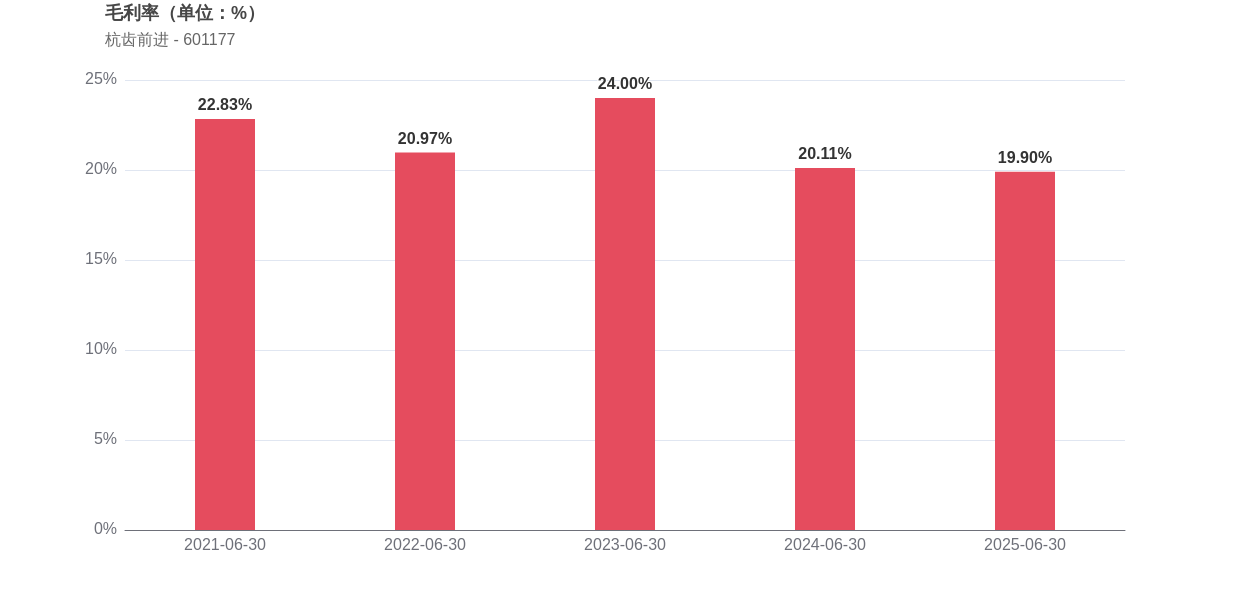 从反映盈利质量的指标来看,杭齿前进的净利率由2024年上半年的11.60%提升至12.24%,提升了0.65个百分点,盈利能力有所改善。毛利率从2024年上半年的20.11%下滑至19.90%,下降了0.21个百分点。净资产收益率方面,2025年上半年为4.70%,同比下降了0.05个百分点。