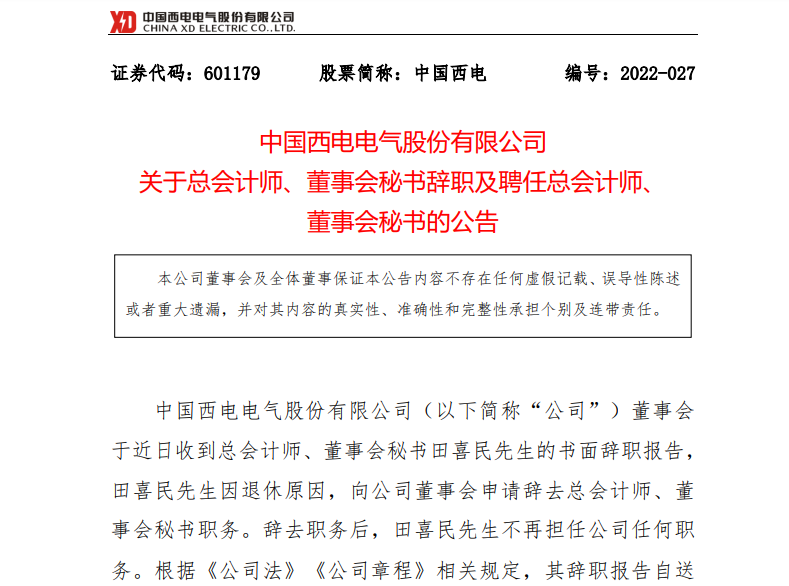 昨日,中国西电电气股份有限公司公告称,董事会于近日收到总会计师、董事会秘书田喜民的书面辞职报告,因退休原因申请辞职。