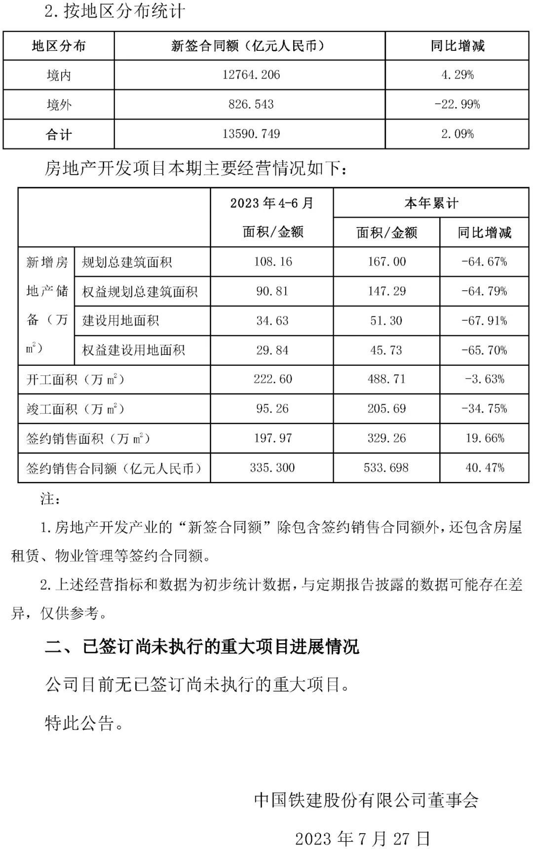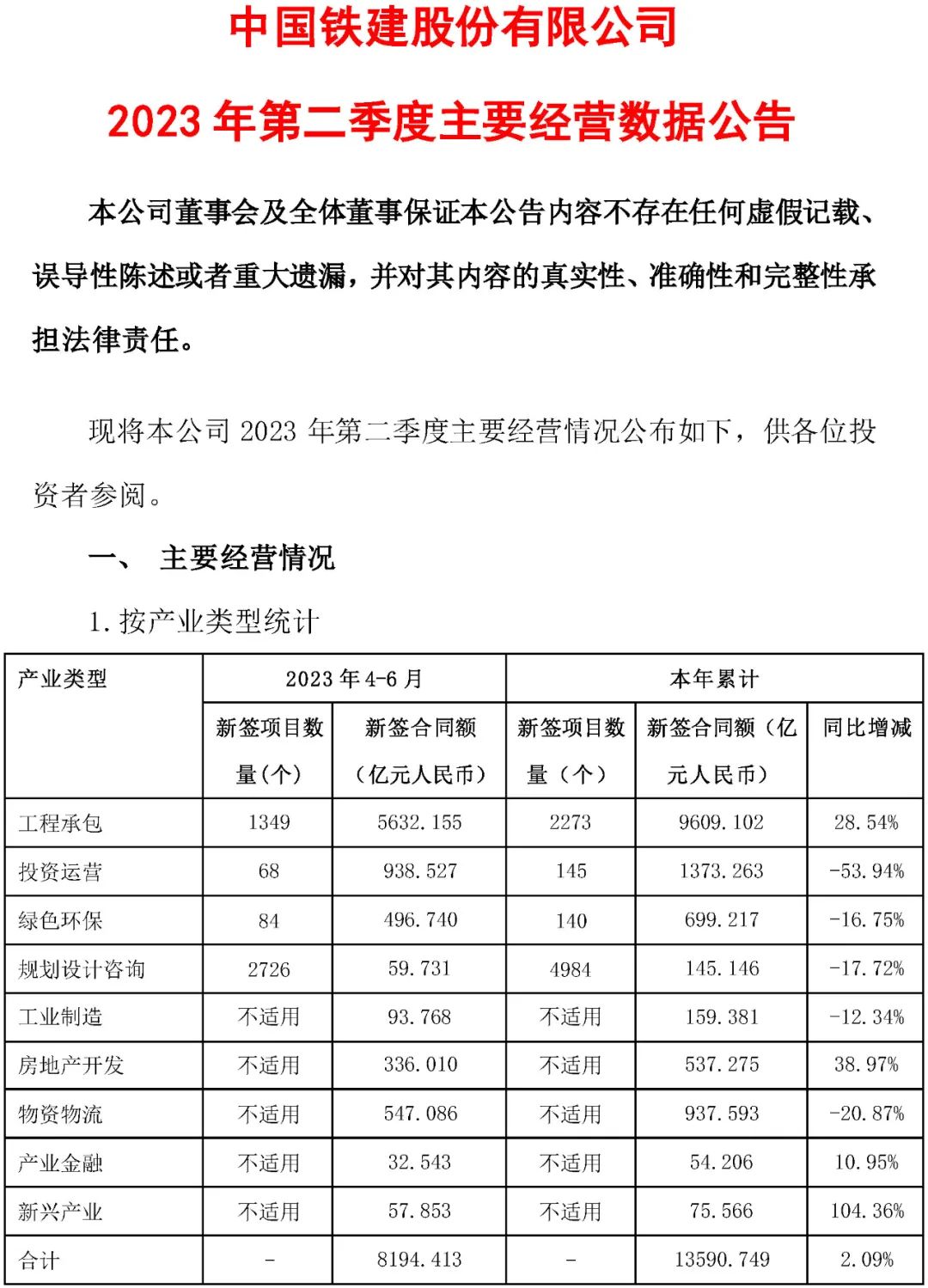 近日,中国铁建发布2023年上半年经营情况公告,累计新签合同额13590.749亿元,同比增长2.09%。其中境内新签合同额12764.206亿元,同比增长4.29%;境外新签合同额826.543亿元,同比减少22.99%。