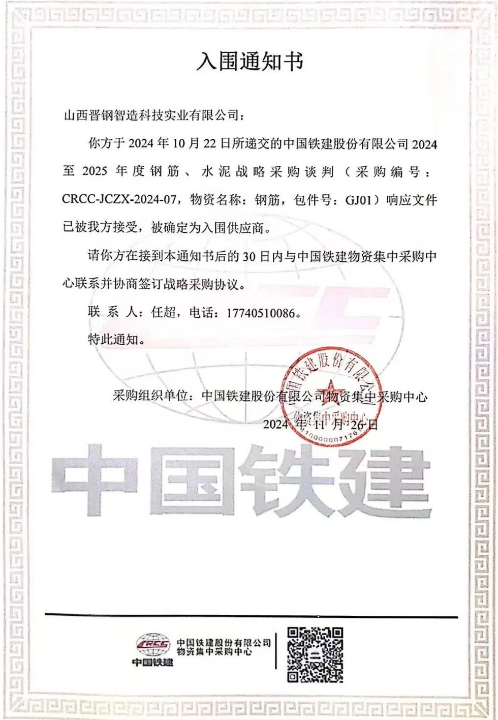 近日,山西晋钢智造科技实业有限公司收到中国铁建股份有限公司的入围通知书,被确定为中国铁建入围供应商。在钢铁行业激烈的竞争浪潮中,这是对晋钢控股集团实力的肯定,也是对集团产品品质的认可。
