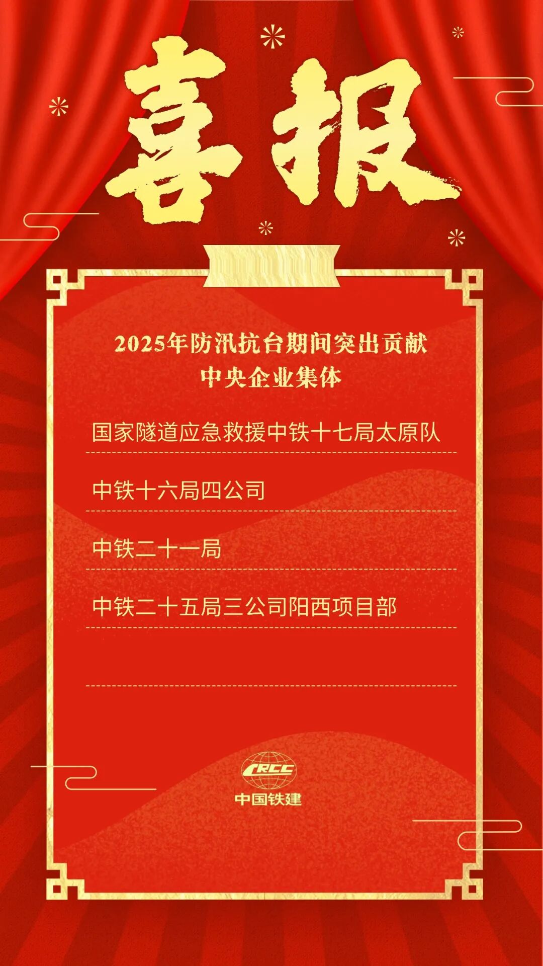 近日,国务院国资委党委通报表扬2025年防汛抗台期间突出贡献中央企业集体,中国铁建所属国家隧道应急救援中铁十七局太原队、中铁十六局四公司、中铁二十一局、中铁二十五局三公司阳西项目部等4个集体光荣上榜,以实际行动展现了中央企业的先锋力量。