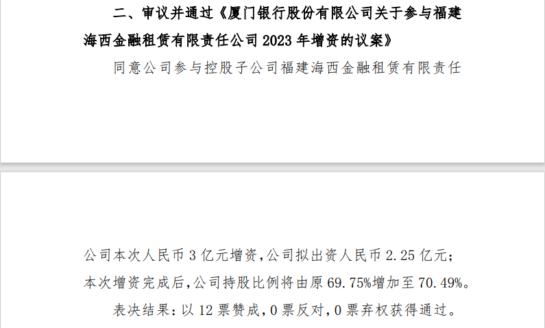 9月28日,厦门银行发布公告:同意公司拟出资人民币2.25亿元参与控股子公司福建海西金租3亿元增资,持股比例将增至70.49%。