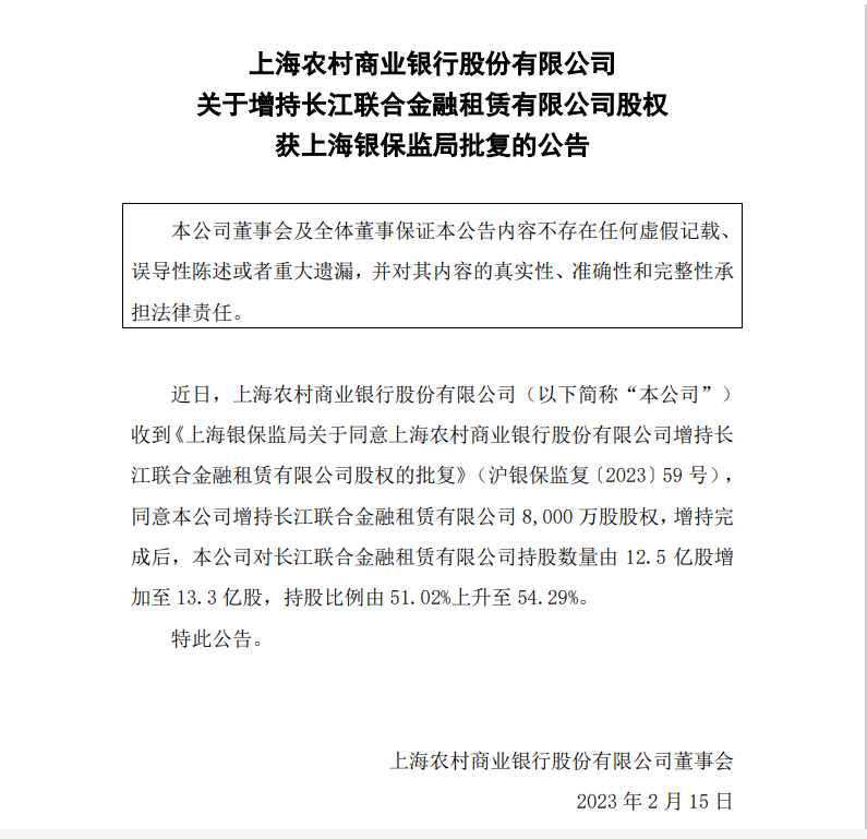 今年2月,上海农村商业银行增持长江联合金融租赁有限公司8000万股股权,投资金额9945万元。增持完成后,持股比例由51.02%上升至54.29%。
